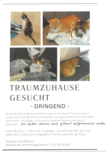 keinerlei Haushaltsgeräusche und KEINE Kinder . Sie suchen ein ruhiges Zuhause mit gesichertem Freigang - nur zu zweit oder zu einem Spielkameraden im passenden Alter dazu.